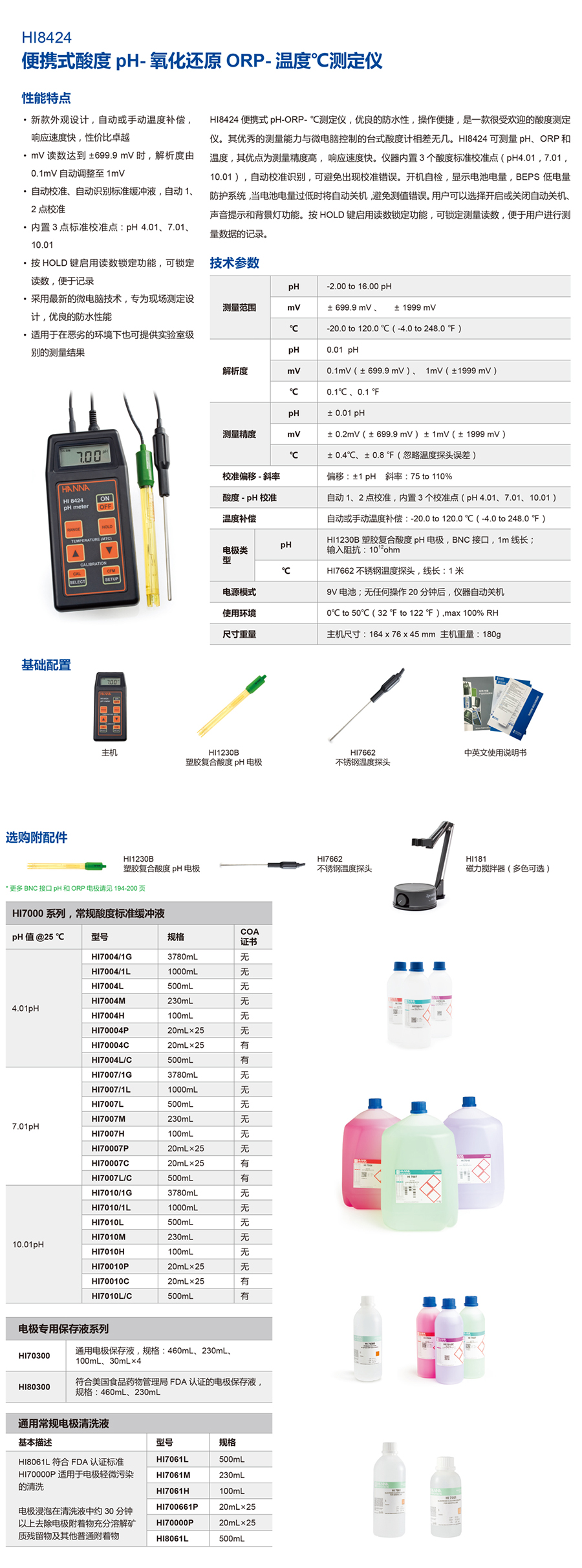 產品描述:pH范圍:-2.00 to 16.00pH;mV范圍:±699.9 mV、±1999 mV LCD屏幕顯示,可使您輕松查看pH、mV、溫度測量讀數(shù);自動識別校準,自動關閉,屏幕指示和自動手動溫度補償,電池更換簡單快速,BEPS低電量防錯系統(tǒng),避免錯誤測量,防水緊湊設計,防止任何水滲入儀器損壞儀器........