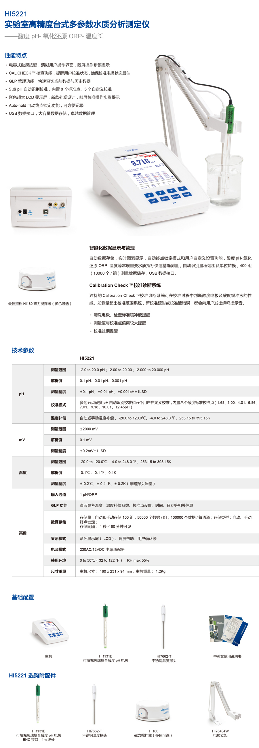 主機(jī),HI1131B 可填充玻璃復(fù)合酸度電極,HI7082 專用電極填充液(規(guī)格:30mL),HI7662-T 不銹鋼溫度探頭,酸度標(biāo)準(zhǔn)緩沖液套裝(標(biāo)準(zhǔn)值@25°C:4.01pH、7.01 pH、10.01PH、常規(guī)電極清洗液,規(guī)格:20mL×10),HI76404W 定制專用電極支架,HI710006/8 AC230V/12VDC 電源適配器,中英文使用說明書