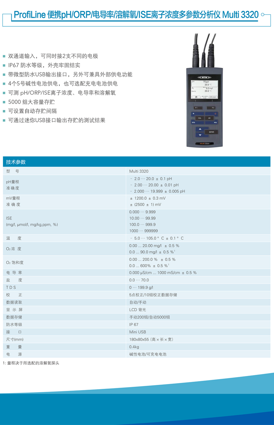 Multi 3320手持式多參數(shù)測試儀,測量PH、ORP、ISE、電導(dǎo)率、溶解氧及溫度,可連接各種模擬的標(biāo)準(zhǔn)PH復(fù)合電極或ORP電極、電導(dǎo)率電極、離子電極和溶解氧電極,LCD背光顯示,可同時(shí)檢測PH值、ORP值、電導(dǎo)率值、溶解氧值、溫度值等多種參數(shù)。