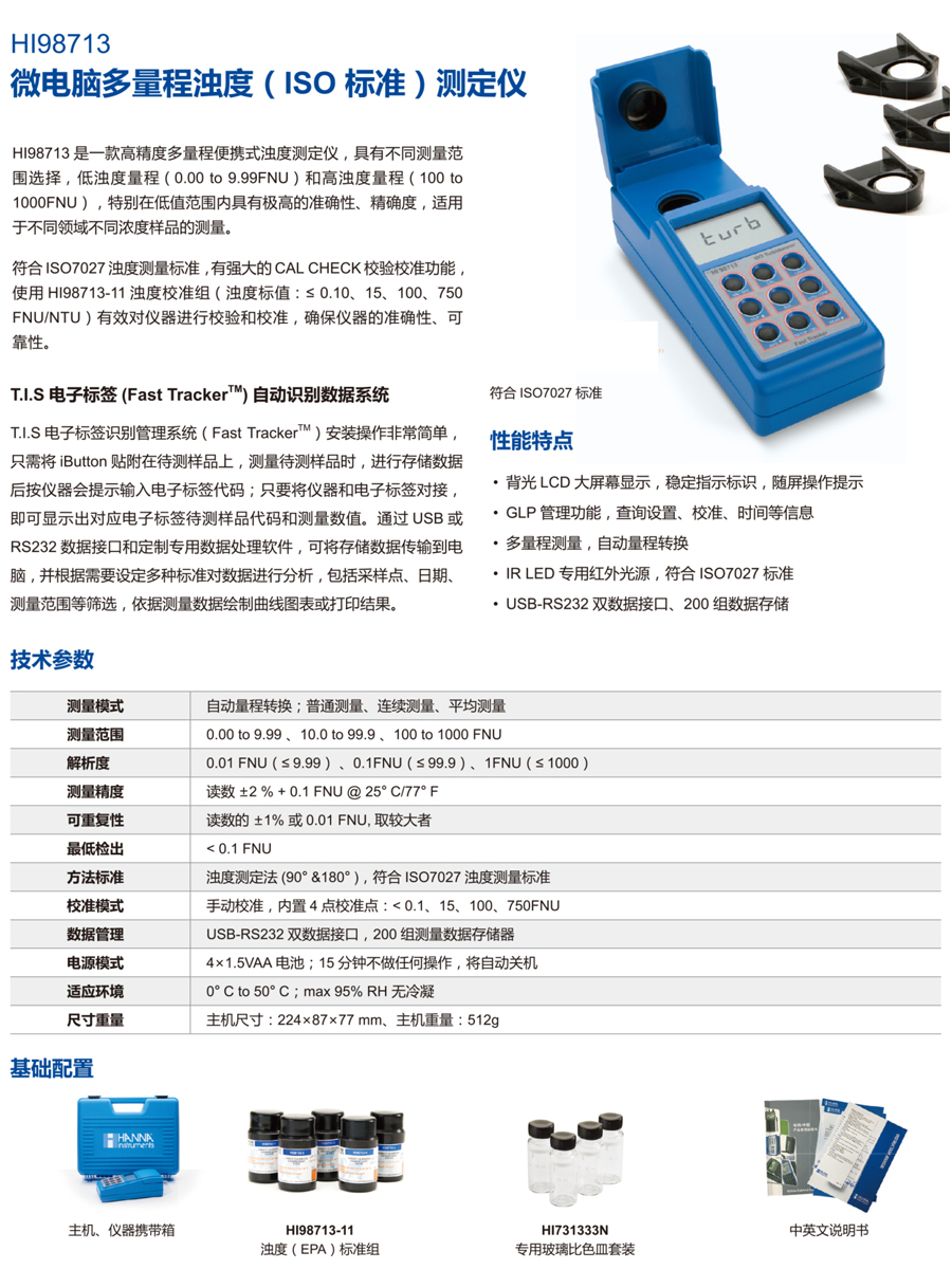 主機(jī),HI98713-11 定制專用濁度(ISO)標(biāo)準(zhǔn)組(標(biāo)值@25°C:≤ 0.1、15、100、750 FNU),HI731333N 專用玻璃比色皿套裝,HI93703-58 玻璃比色杯潤滑劑,HI920005 T.I.S電子標(biāo)簽(5個(gè)),HI710006 AC230V/12VDC 電源適配器,中英文使用說明書,HI710134 定制專用儀器攜帶箱【溫馨提示:建議訂購HI93703-50比色皿清潔液和HI731318玻璃比色皿清潔布,用于玻璃比色皿清潔修復(fù),確保測量精度和讀數(shù)準(zhǔn)確度】