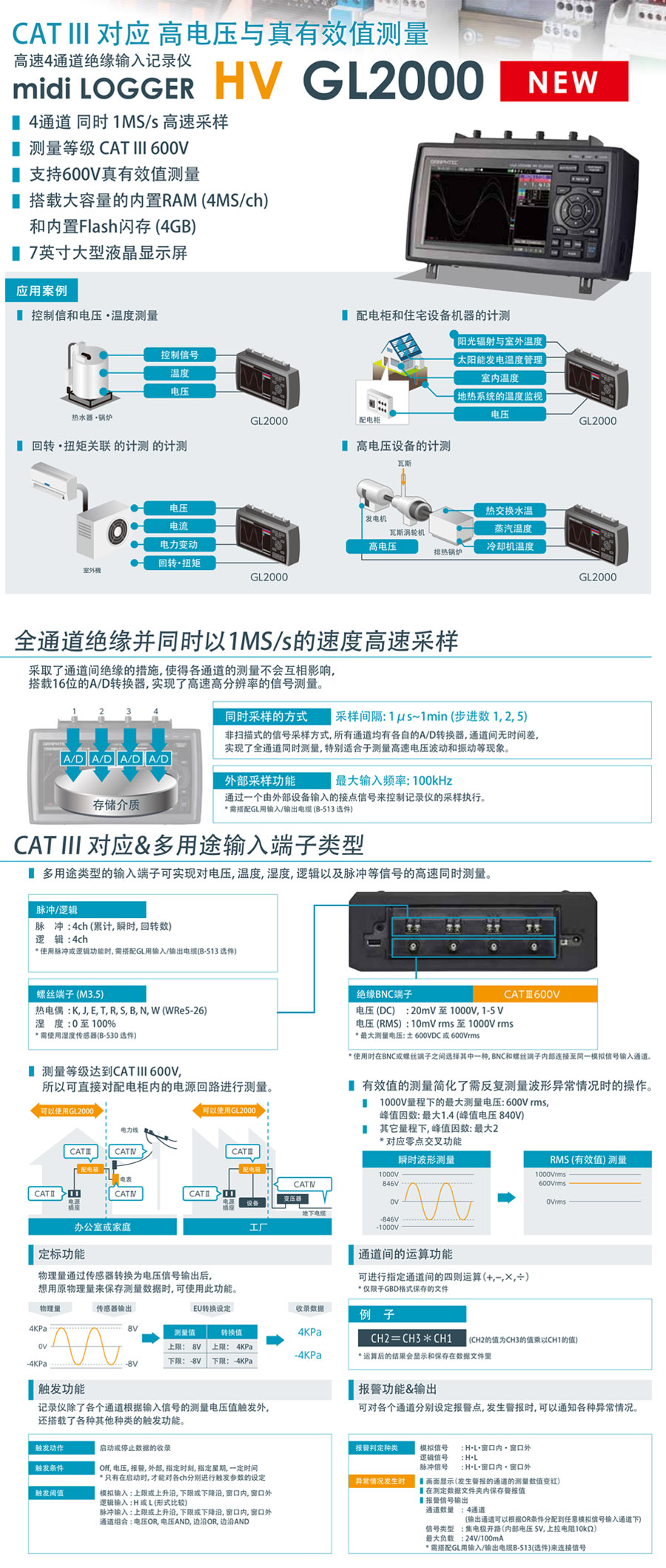 產(chǎn)品描述:日本圖技GL2000多通道數(shù)據(jù)記錄儀是原GL900-4記錄儀的升級(jí)產(chǎn)品,新型號(hào)可實(shí)現(xiàn)高速 1MS/s 的同步采樣,可以高效測(cè)量電壓、電流、溫度、壓力、流量和邏輯信號(hào)。對(duì)應(yīng)CAT III 600V以及600V有效值的測(cè)量,支持CAT III 600V測(cè)量等級(jí)要求,可測(cè)量三相電源電壓峰峰,值和RMS值的波動(dòng)........