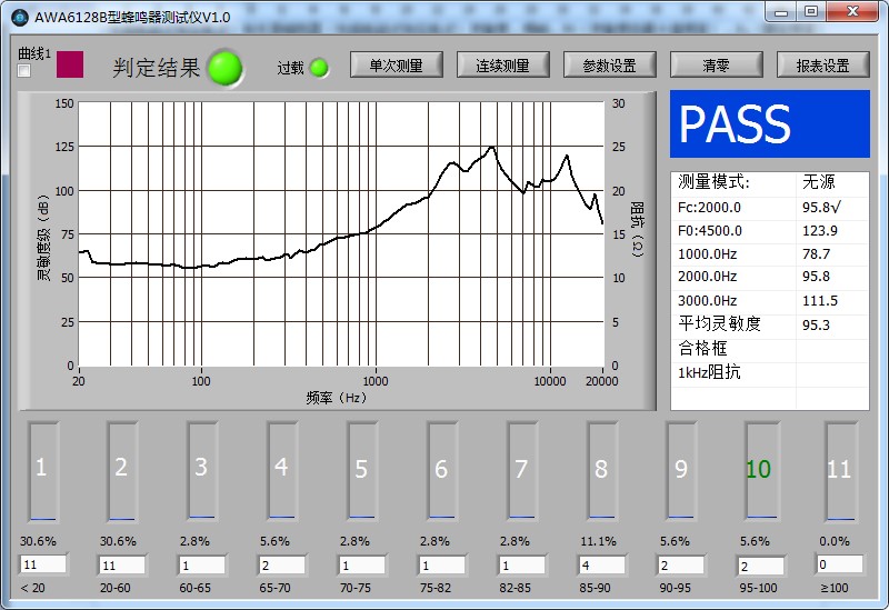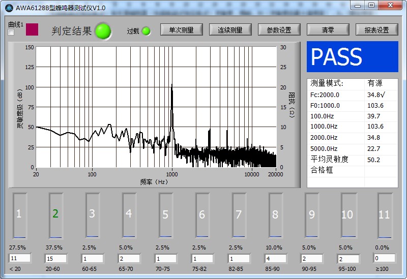 蜂鳴器測(cè)試儀是專用于蜂鳴器電聲特性測(cè)試的儀器。測(cè)試儀可以測(cè)試包括有源(包括電磁式和壓電式)和無(wú)源(包括電磁式和壓電式)兩種類型的蜂鳴器電聲指標(biāo)。有源蜂鳴器通過(guò)輸入蜂鳴器的直流電壓,并選擇輸出方式,在主界面上會(huì)顯示在一段頻率范圍內(nèi)的頻譜曲線,同時(shí)在右邊的結(jié)果顯示框中顯示最高點(diǎn)的頻率及靈敏度級(jí),蜂鳴器出廠的額定頻率及對(duì)應(yīng)的靈敏度級(jí)(頻率可以在參數(shù)設(shè)置界面自行輸入)。無(wú)源蜂鳴器通過(guò)輸入信號(hào)幅度,并可以自定義輸出的頻率范圍,在所定義的頻率范圍內(nèi)輸出頻響曲線。同時(shí)可以顯示平均靈敏度,諧波失真,阻抗及曲線最高點(diǎn)的頻率及相對(duì)應(yīng)的靈敏度級(jí),同時(shí)還可以顯示出廠額定頻率及對(duì)應(yīng)的靈敏度級(jí)。測(cè)試結(jié)束后,根據(jù)自定義的標(biāo)準(zhǔn),簡(jiǎn)潔直觀的顯示 PASS/FAIL,自動(dòng)判斷是否合格。可以和自動(dòng)分選機(jī)臺(tái)配合使用,自動(dòng)判斷是否合格,進(jìn)行產(chǎn)品分檔,極大的提高了測(cè)試效率。