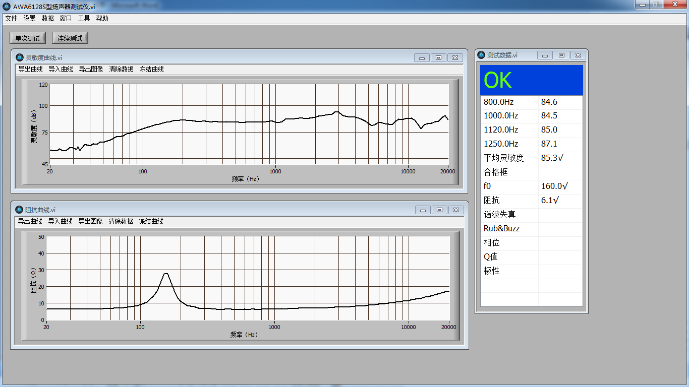 AWA6128S 型揚聲器測試儀執(zhí)行《GB/T 12060.5聲系統(tǒng)設(shè)備:揚聲器主要性能測試方法》(IEC60268-5)標準。該儀器由專用測量分析電路, PC機和專用的分析軟件組成,功能強大,操作便捷。充分降低初期成本的投入和維護費用,具有高效、強大的分析和處理能力。能快速地完成電聲產(chǎn)品揚聲器的測試,是基于生產(chǎn)線和質(zhì)量控制(QC)、操作簡易的要求而開發(fā)的測試系統(tǒng)。它將功率放大模塊,聲音測量模塊集成在一臺主機里,免去了用戶連線的煩惱。儀器可以同時測量揚聲器頻響、阻抗、諧波失真、極性、異音等參數(shù)。根據(jù)設(shè)定的門限判斷揚聲器合格品或不合格品。測試結(jié)束后,簡潔直觀的顯示出PASS/FAIL,極大的提高了測試效率。