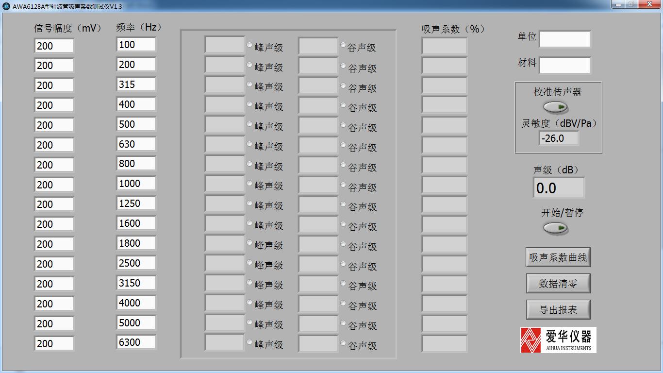 AWA6128A型駐波管吸聲系數(shù)測試儀用于測定垂直入射條件下吸聲材料的吸聲系數(shù)。測試儀由駐波管、傳聲器、測試主機(jī)、顯示器、鍵盤鼠標(biāo)等組成。測試儀軟件根據(jù)測量到的峰聲級值和谷聲級值自動計算出吸聲系數(shù),并能生成吸聲系數(shù)與頻率的坐標(biāo)曲線。儀器輸出信號的頻率和幅度在規(guī)定范圍內(nèi)可自由設(shè)定。由于只需少量的吸聲材料作試件,所以對于吸聲材料的參數(shù)研究和設(shè)計特別適合。