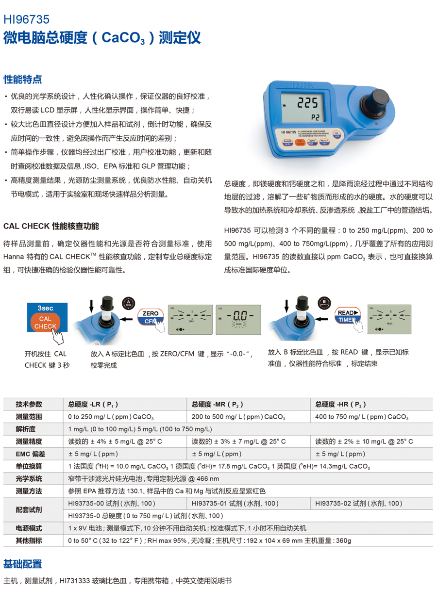 溫馨提示:新款HI97735 總硬度測(cè)定儀,將總硬度【CaCO3】讀數(shù)轉(zhuǎn)換成法國(guó)度【oF】讀數(shù)、 英國(guó)度【oE】讀數(shù)或者德國(guó)度【odH】讀數(shù),滿(mǎn)足您對(duì)不同測(cè)量單位結(jié)果需求。